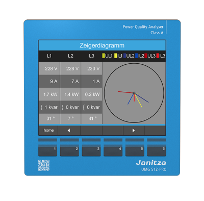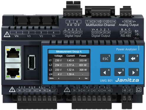 • UMG 512-PRO: Bộ phân tích chất lượng điện lớp A, đáp ứng tiêu chuẩn (EN 50160, IEC 61000-4-30), ghi nhận sự kiện từ 20 ms và transient từ 50 µs. Với 6 kênh đo dòng điện, thiết bị hỗ trợ giám sát tải không cân bằng và phân tích méo dạng sóng, phù hợp cho các mạch cấp nguồn cần độ chính xác cao.
