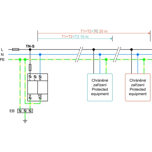 • In case of the installation of a type T1+T2+T3 in the main switchboard, it is also necessary to install type T2 and T3 in any additional distribution boards in the electrical installation.