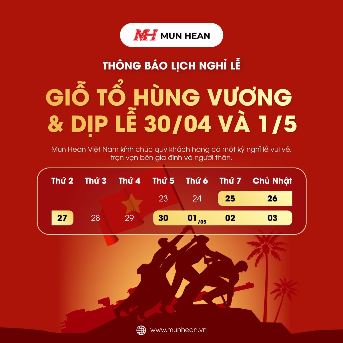 MUN HEAN VIỆT NAM THÔNG BÁO LỊCH NGHỈ LỄ GIỖ TỔ HÙNG VƯƠNG, 30/4 VÀ 1/5 NĂM 2026